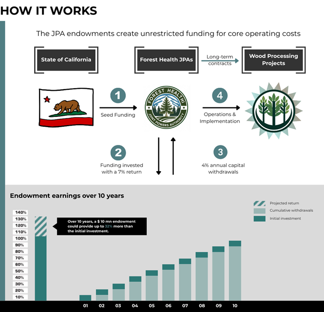An innovative approach to multiplying the impact of a JPA’s funding endowment is to allocate a portion of the principal for low-interest loans to forest health operations and wood products businesses. By acting as a community-based lender, the JPA can support local projects that might otherwise struggle to access affordable capital, accelerating restoration and market development. The interest payments received from these loans can then be reinvested into the endowment, steadily growing the principal over time. This strategy not only amplifies the reach of the original endowment but also creates a self-reinforcing cycle of investment and impact, enhancing both financial sustainability and landscape resilience.