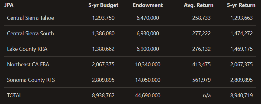 Russell developed an example endowment return schedule based on five pilot JPA annual budget estimates. The 5-year budget is an estimate from the respective JPA proponents. An estimated 0.2% administrative fee and $5,000 contribution to the principal are included in the calculations. The Central Sierra South example is being developed from an existing JPA (Central Sierra Economic Development District or CSEDD) and, therefore, may not be directly comparable to the other four startup JPAs. A similar example in development is the Eastern Sierra Council of Governments (ESCOG). RRA = Risk Reduction Authority, FBA = Forest Biomass Authority, RFS = Regenerative Forest Solutions. JPA endowments are not limited to these examples.